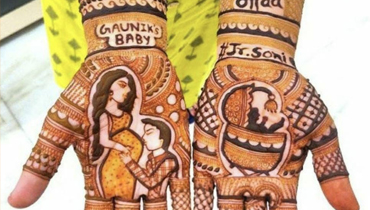 Beautiful baby-themed Mehandi with tiny footprints, floral patterns & elegant designs perfect for baby shower celebrations.